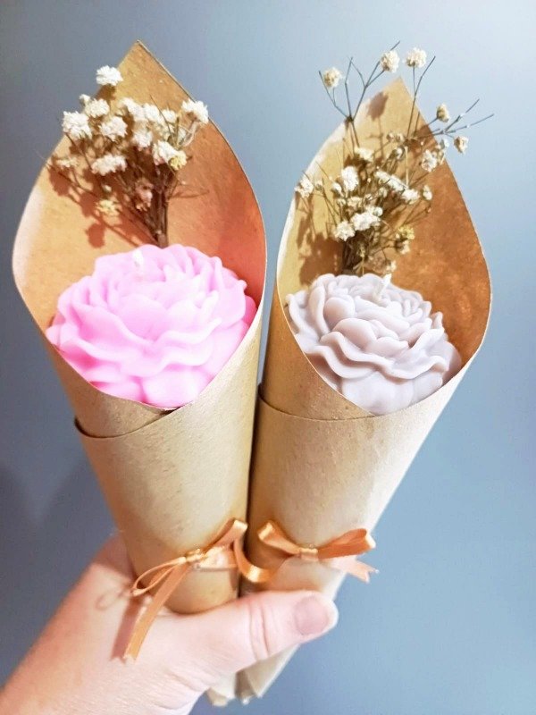 Peonia pequeña en ramo. Cada una es una vela de molde aromatizada.
